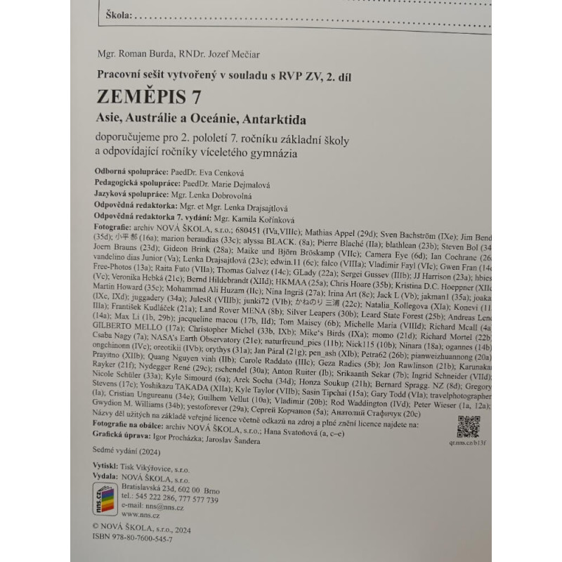 Nový barevný pracovní sešit tvoří funkční celek s učebnicí, také vychází z koncepce RVP ZV. Pracovní sešit obsahuje především úkoly k pochopení a upevňování učiva. Tento sešit je možné využít místo vlastních sešitů žáků. Žáci si v tomto sešitě procvičí a osvojí záživnou a nápaditou formou všechny základní pojmy z učebnice. V úvodu každé kapitoly je krátký text, který má nejen edukační, ale i motivační funkci. Pochopení textu a navazující úkol rozvíjejí čtenářskou gramotnost, stejně jako řada úkolů pracovních sešitů, které vycházejí z porozumění textu uvedeného v učebnici. Jednotlivé celky jsou uzavřeny souhrnným opakováním a sebehodnotící tabulkou. Úkoly v pracovních sešitech podporují rozvoj zeměpisné gramotnosti.